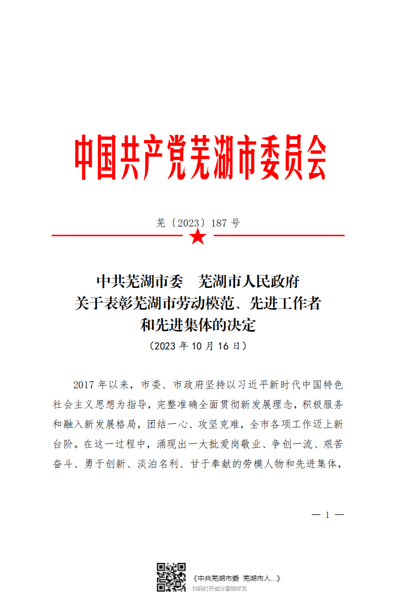 近日,蕪湖市委印發(fā)了《中共蕪湖市委蕪湖市人民政府關于表彰蕪湖市勞動模范、先進工作者和先進集體的決定》(蕪〔2023〕187 號),前灣集團榮獲“蕪湖市先進集體”稱號!